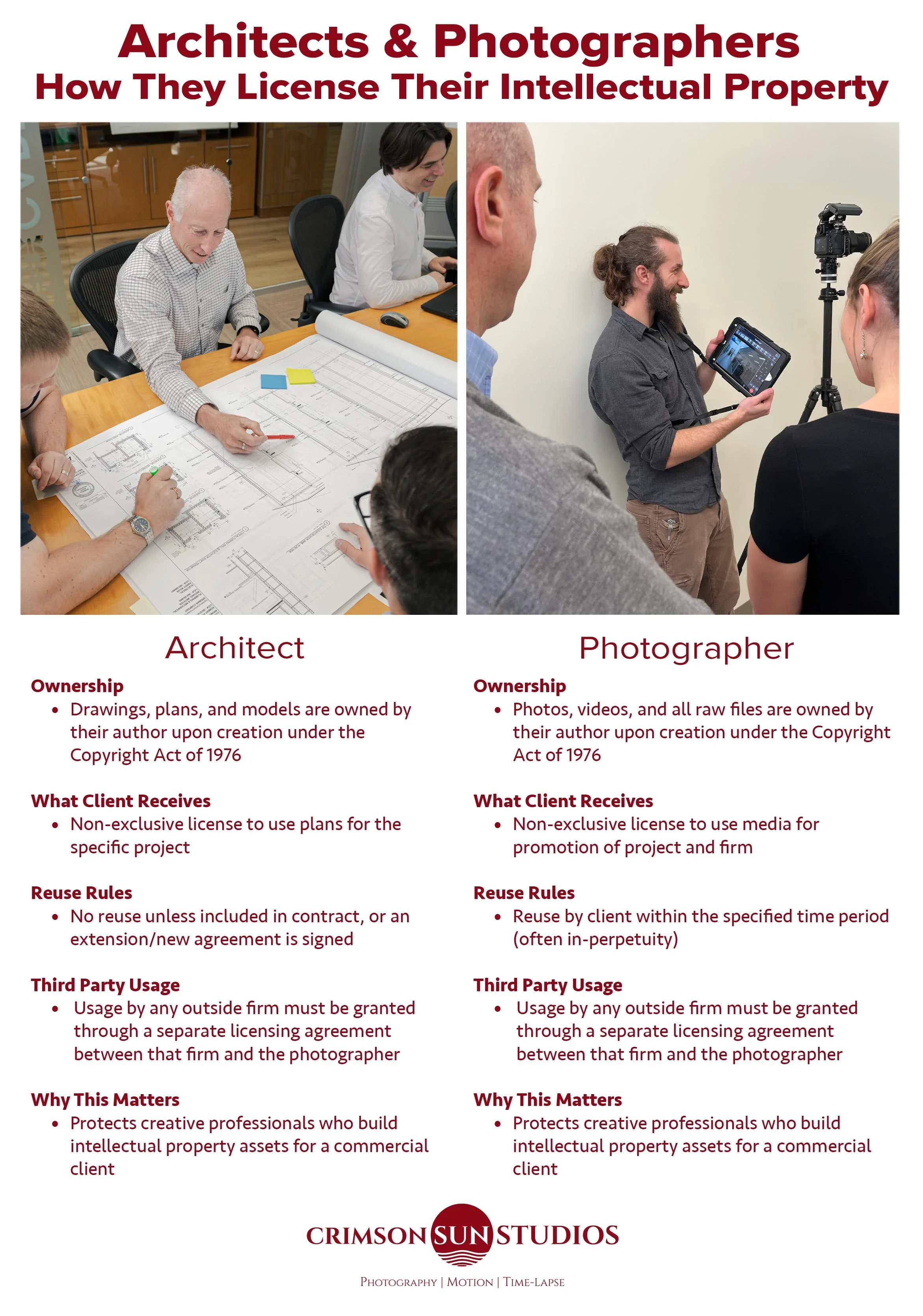 Architects and photographers actually share more common ground than most people think. Both professions create work that blends technical skill and creativity. And in both cases, that work remains valuable long after the work is delivered. The drawings an architect provides and the photos we produce as architectural photographers are protected as intellectual property because they represent years of experience and a careful creative process.